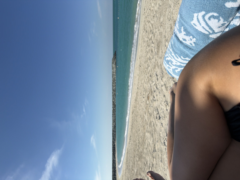 The image presents a first-person perspective shot from a sandy beach in Ghadeer Al Tayr, United Arab Emirates. In the immediate foreground, the upper thighs and lower torso of one individual are visible, exhibiting a tanned skin tone. A light blue towel with a white coral pattern is positioned under the individual's right leg. The subject is in a reclined position, facing the sea. The middle ground consists of a wide, light-colored sand beach that curves towards a prominent man-made rock barrier, or breakwater, extending into the water. Beyond this barrier, the sea displays a turquoise hue, with small waves breaking near the shore. Several small, white buoys are visible in the water in the mid-distance. The background features a clear, bright blue sky with sparse, wispy white clouds. The scene is illuminated by strong daylight, indicating clear weather. No other individuals or specific actions beyond reclining are discernible.