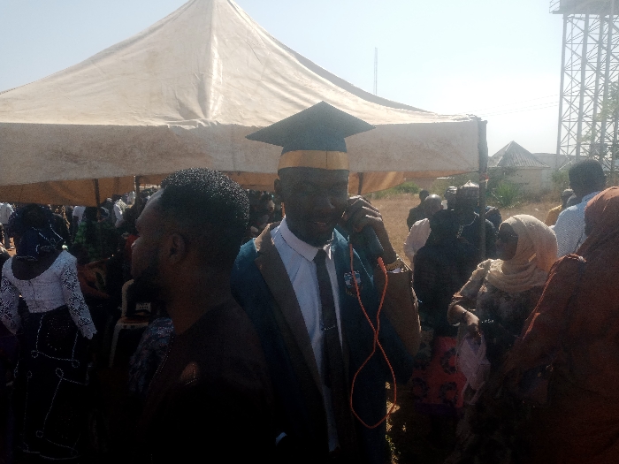 An outdoor gathering in Gwafan, Nigeria, features a young man in a dark graduation gown, white shirt, and dark tie, wearing a square academic cap with a gold band