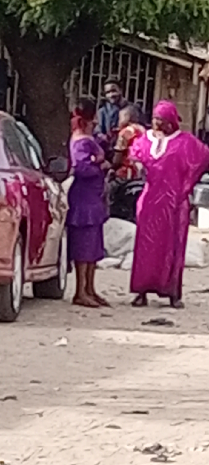 The image captures an outdoor street scene in Gwagwarwa, Nigeria, during daylight. Two adult women dominate the foreground on unpaved, light-brown ground scattered with minor debris. The woman on the left wears a purple, possibly layered, garment and stands barefoot, with her arms held in front of her. Facing her is the woman on the right, dressed in a fuchsia-colored full-length gown with a white V-neck trim and a matching headwrap, wearing open-toed footwear and standing with her hands on her hips. On the far left, a maroon-colored car with silver wheel rims is partially visible, showing its rear passenger side. In the mid-ground, behind the prominent women, an adult wearing a dark blue shirt and a light-colored face covering is partially discernible, along with several smaller figures, likely children, one appearing to be held. The background includes a dark tree with green foliage on the left, and a structure with dark vertical bars, possibly a gate or fence, adjacent to a light-colored building wall on the right.
