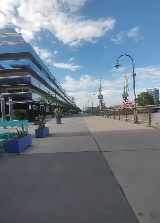 view of a waterside promenade or pier on a bright, sunny day. On the left is a modern building with multiple floors and a blue mirrored facade. Alongside the building are planters containing greenery and turquoise benches. The promenade stretches into the distance, flanked on the right by a railing and the water's edge. In the middle ground, there are several large cranes, remnants of the port's industrial past. The sky is blue with scattered white clouds, and the sun is visible. The scene is quiet and appears to be devoid of people.