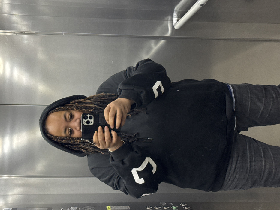 The scene depicts a single individual inside an elevator located in the city of Altenheim, Germany. The individual, an adult with dreadlocked hair and dark skin, is wearing a black hooded sweatshirt featuring a white numeral '3' on the left sleeve and an incomplete white symbol resembling a 'C' or 'D' on the right sleeve, paired with dark gray jeans. They are holding a dark-colored smartphone with both hands, positioned to capture a mirror selfie reflection. The smartphone has a prominent multi-lens camera array and is enclosed in a black case with a small side flap. The elevator interior features brushed metallic wall panels, a control panel with circular buttons visible on the left, and a white horizontal handrail mounted on the right wall.