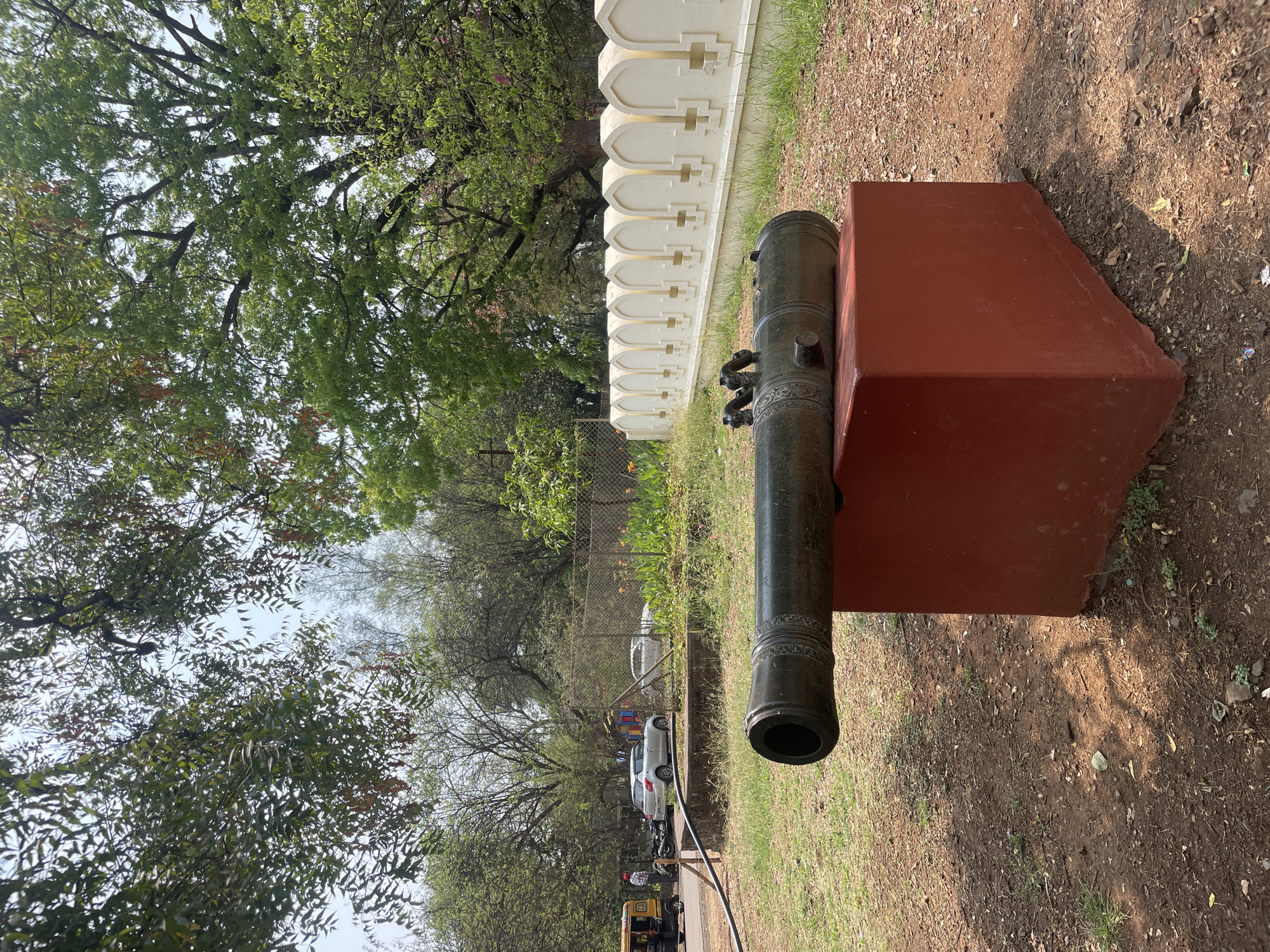 This image depicts an outdoor scene within the grounds of the New Palace (Chhatrapati Shahu Museum) in Kolhapur, Maharashtra, India. **Subjects and Objects:** In the foreground, a large, dark-colored cannon, likely bronze or iron, is mounted on a solid, rectangular pedestal painted reddish-orange. The cannon's muzzle is directed towards the left, and its barrel exhibits decorative banding. The ground surrounding the pedestal is composed of reddish-brown soil with scattered patches of green grass and minor debris. To the right and behind the cannon, a cream-colored wall with a series of arched, ornamental niches, accented with gold-colored details, extends horizontally. In the mid-ground and background, particularly to the left, a chain-link fence separates the foreground area from a paved road. On this road, a yellow auto-rickshaw is visible, alongside a silver Maruti Suzuki Swift car parked further back. A male individual, wearing a red cap and a plaid shirt, stands near the auto-rickshaw. A well-like structure with a black hose is also present near the road. The entire background is dominated by a dense canopy of various green trees under a bright, clear sky. **Actions and Interactions:** The scene is static; no explicit actions or direct interactions are occurring. The male individual in the background appears to be standing idly. **Environment:** The environment suggests a historical site or park setting. Lighting indicates clear daylight conditions, likely mid-day, with shadows cast to the right of the cannon and pedestal.