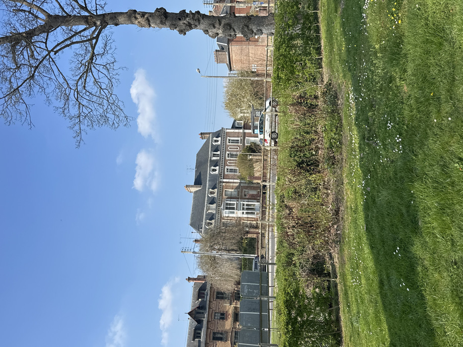 This image presents a residential street view in Beauvais, France, under a clear, bright sky