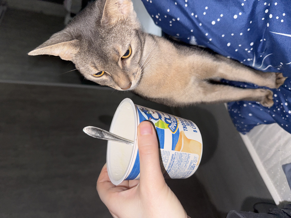 - "A gray cat with golden eyes stares intently at a container of yogurt with a spoon sticking out of it, held by a hand" by FM-FSkyE2, licensed under CC BY 4.0