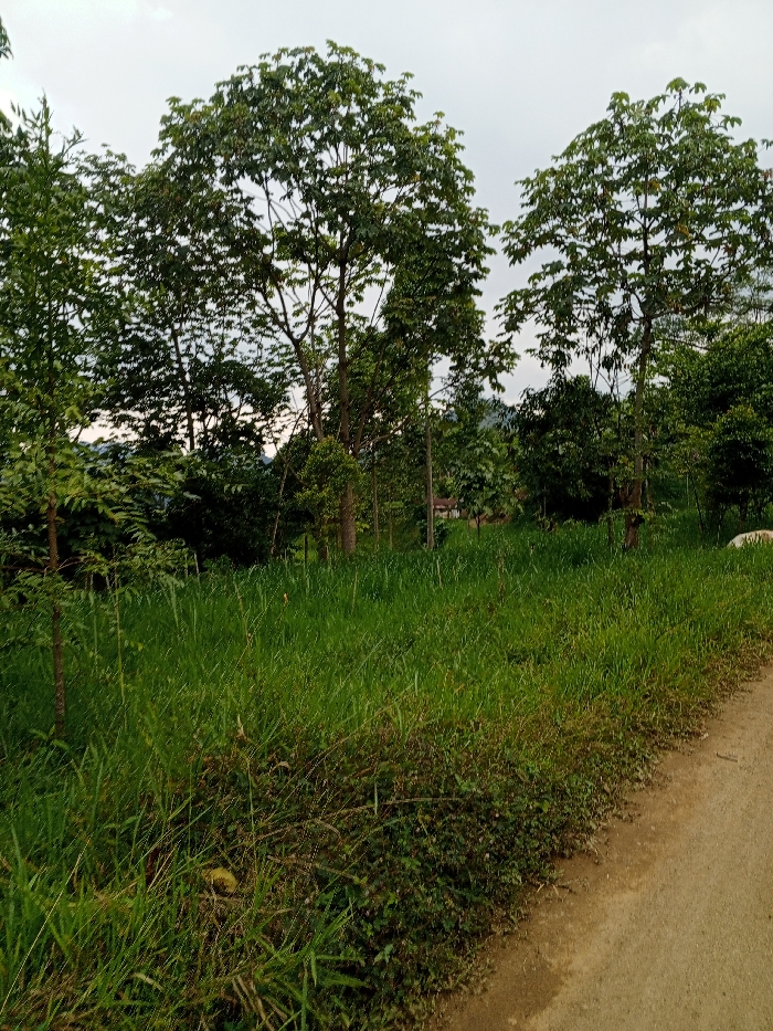 The scene depicts an outdoor landscape in Thotagamuwa, Sri Lanka, under a uniformly light grey, overcast sky. A light brown, unpaved dirt path extends along the right side of the frame, from the foreground into the midground. Adjacent to the path on its left, the ground is covered by dense green grass and smaller, darker green vegetation. Further left and into the midground, a field of tall green grass is visible. Beyond this, numerous trees with varied green foliage and trunk widths are scattered, forming a dense line towards the background. Several prominent trees with broad, light green leaves are situated in the upper midground. In the distant center-right, a structure with a reddish-brown roof is partially obscured by trees. A small, irregularly shaped white object rests on the ground at the far right edge of the frame, adjacent to the dirt path. No individuals or animals are present.