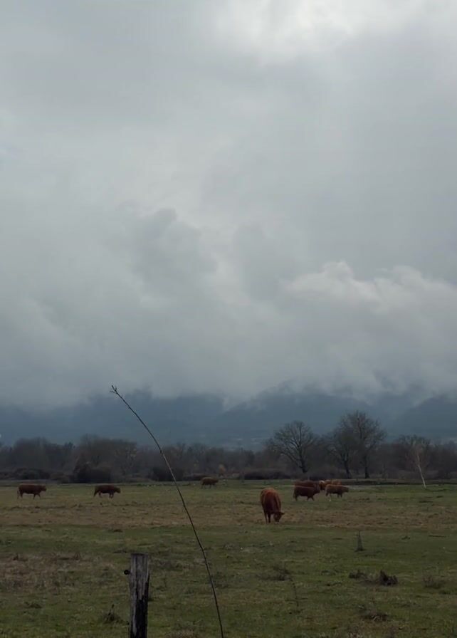 The scene is a rural landscape under a cloudy sky. A herd of brown cows is scattered across a grassy field, grazing. In the background, a range of mountains is partially obscured by low-hanging clouds. A wooden fence post stands in the foreground, with a single, bare branch extending into the frame. The overall impression is one of a quiet, overcast day in the countryside.