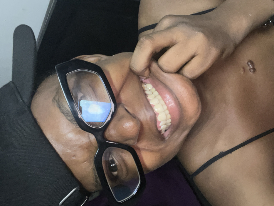 A close-up, high-angle photograph, taken in Lokoja, Nigeria, features an individual with dark skin. The subject wears a black baseball cap, reversed, with a silver-toned clip attached to its left side. Black, wide-framed eyeglasses are worn, reflecting a blue-white rectangular light source in the right lens. The individual is dressed in a black spaghetti-strap top. A broad smile is evident, revealing natural-colored upper and lower teeth and gums. The subject's left hand grasps and pulls the left corner of the mouth, extending the smile. A small, brown, beaded item hangs on the upper chest, adjacent to a raised skin lesion. The background is dark and indistinct, suggesting an indoor environment with direct frontal illumination.