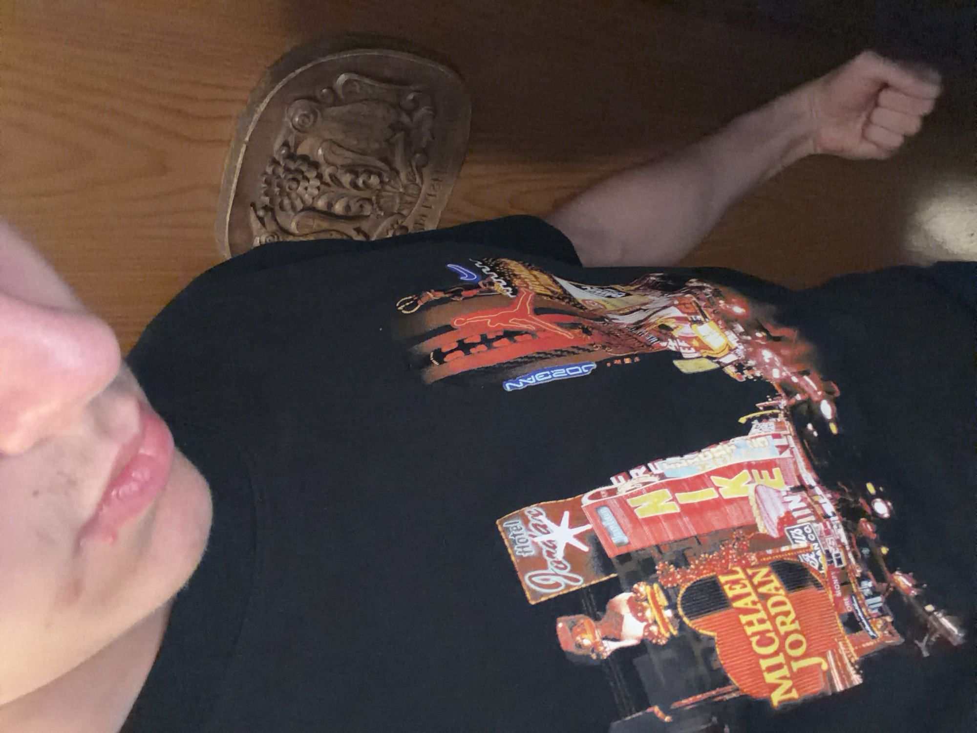 person wearing a black t-shirt with a Michael Jordan themed graphic