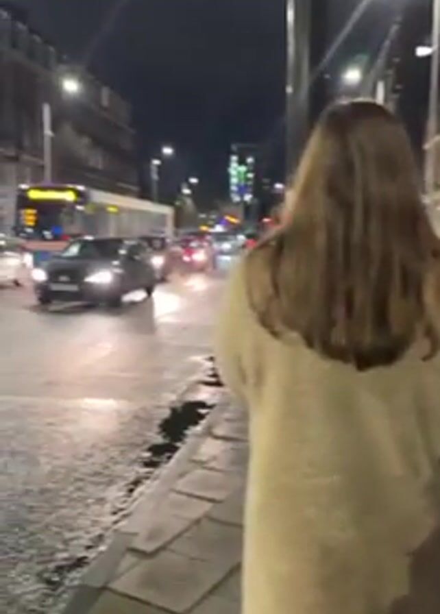 night street scene. Several young people stand on the sidewalk. Traffic passes on the wet street. Street lights illuminate the area. A voice asks "Who is going to the pub?"