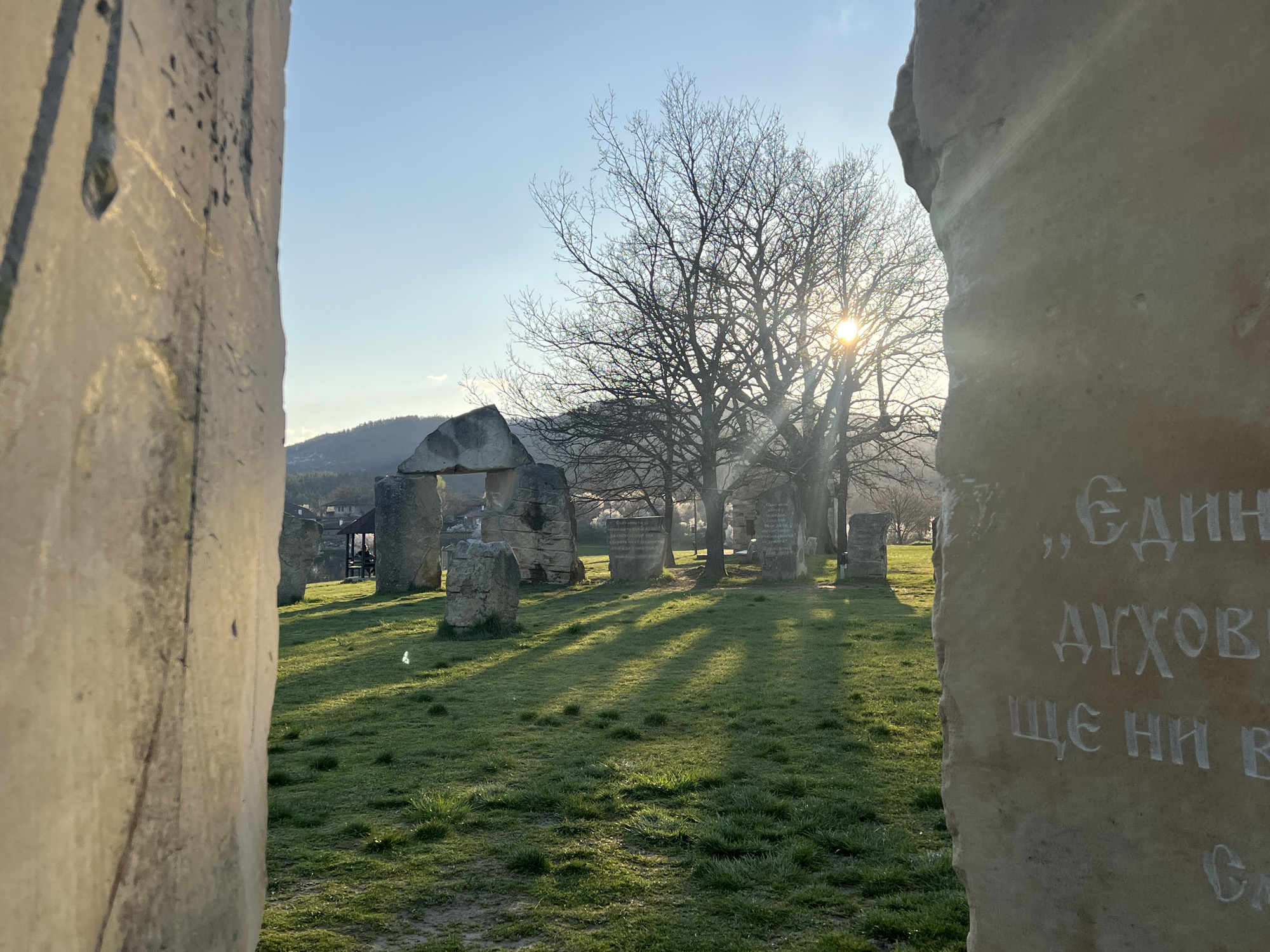 grassy field in the city of Gardevtsi, Bulgaria, containing stone monuments arranged in a circle, reminiscent of Stonehenge. The monuments are made of light-colored stone, with some bearing inscriptions in Cyrillic script. The photograph is framed by two large stone slabs on the left and right sides, creating a peephole effect. A large bare tree stands in the center of the monument circle, with the sun shining behind it. A slight hill can be seen in the background. The light suggests it is either sunrise or sunset. There are no people visible in the immediate foreground. A gazebo can be seen in the distance.