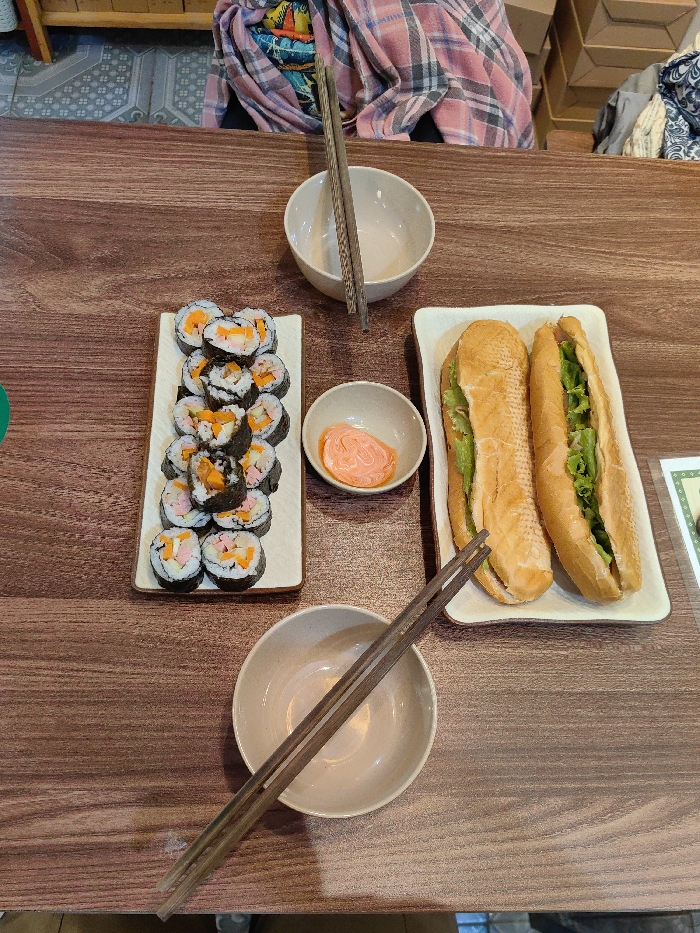 The image displays a dining scene from a top-down perspective on a dark-stained wooden table in Hoa Lư Ward, Vietnam. A rectangular white plate on the left holds approximately 18 pieces of maki-style sushi rolls, likely Kimbap, which include visible fillings of orange (carrots) and a pinkish processed meat, encased in dark nori seaweed and white rice. To the right, a second rectangular white plate contains two Bánh mì sandwiches, each sliced longitudinally and filled with green lettuce and other components within golden-brown baguettes. A small round white bowl holding a light orange, creamy dipping sauce is situated between the two food plates. Two empty light-colored ceramic bowls, each with a pair of wooden chopsticks resting across it, are positioned at the top and bottom center of the frame. The upper torso of an individual, dressed in a pink and white plaid garment over a colorful patterned top, is partially visible in the background. The environment behind the table includes a light-colored floor with a repeating geometric tile pattern, along with stacks of cardboard boxes and folded blue and white patterned fabric.