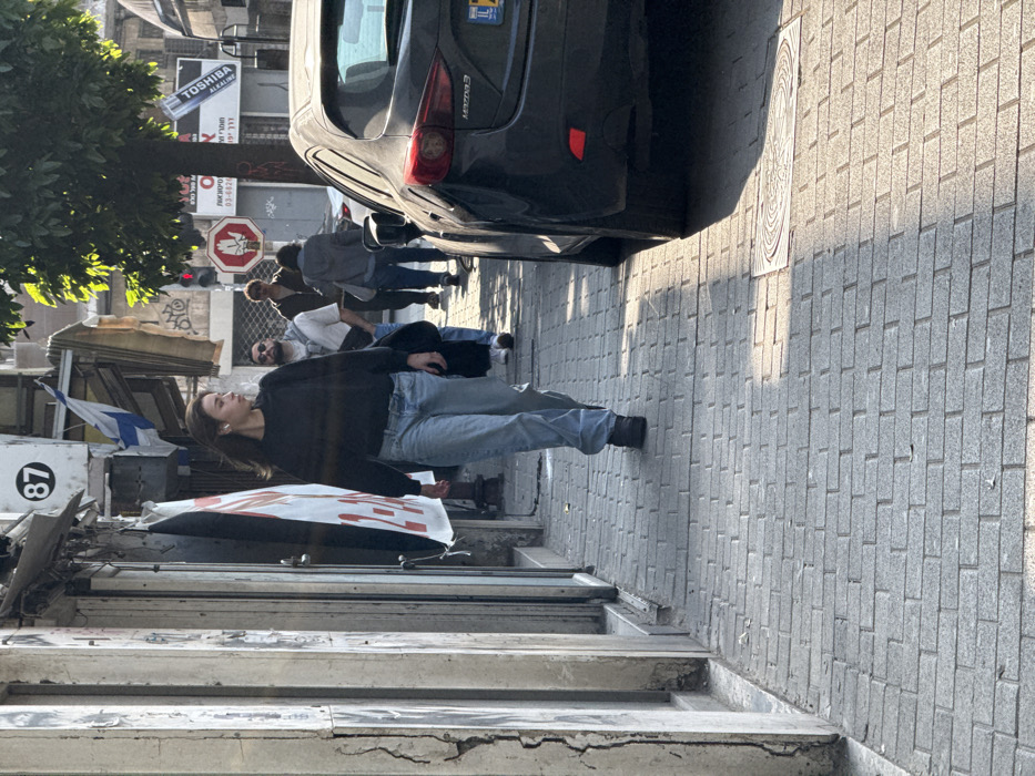 The image depicts a daylight street scene in Tel-Aviv, Israel, characterized by urban architecture, pedestrians, and a parked vehicle