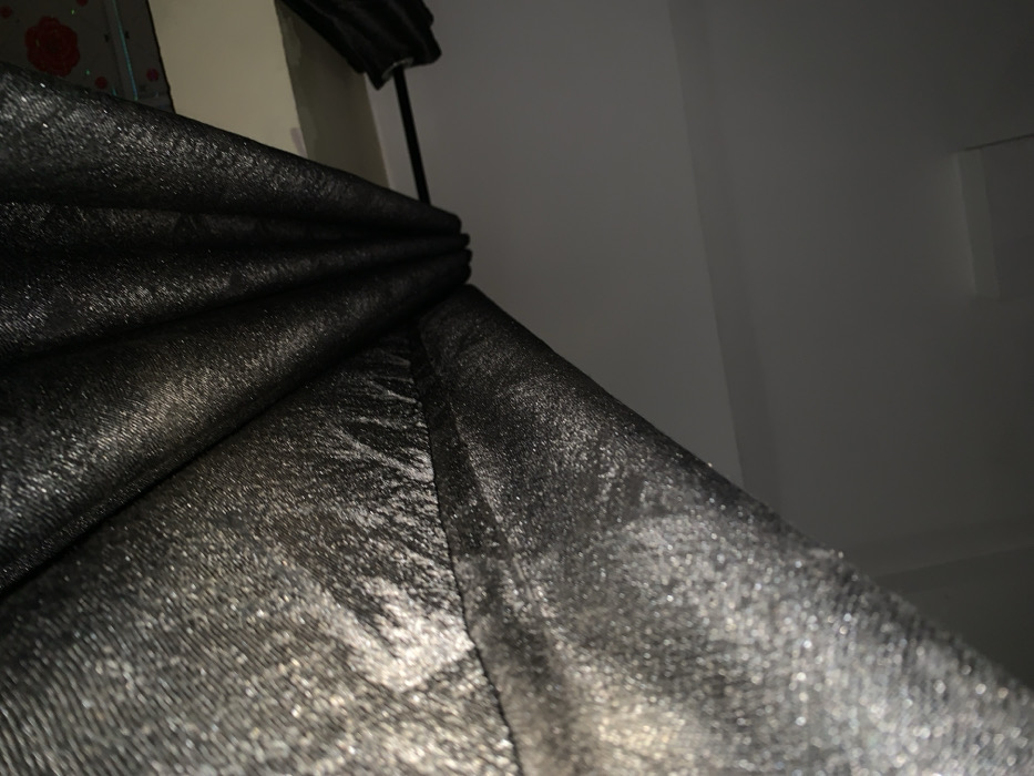 A close-up view features dark, shimmering fabric draped in folds, occupying most of the frame. The texture appears rough, possibly metallic. Behind the fabric, glimpses of a white or light-colored wall and a portion of a black object, possibly a chair or stand, are visible. The composition is dominated by the fabric's texture and the play of light across its surface.