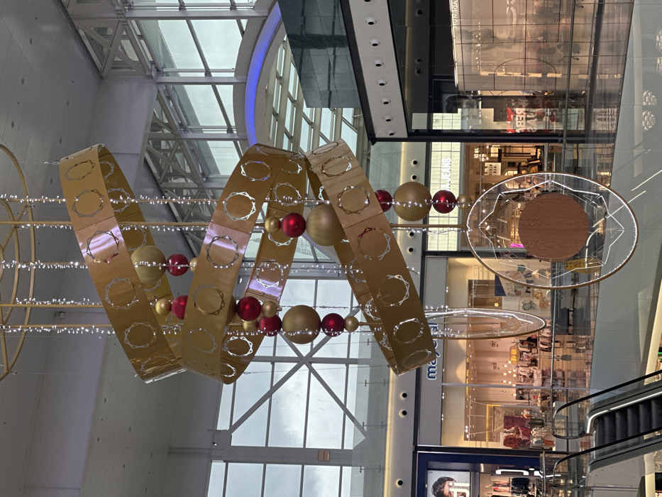 Inside a shopping mall, a large decorative ornament hangs overhead. It consists of gold ribbon-like structures adorned with silver circular patterns and interspersed with red and gold orbs. Above, a skylight with a blue accent and metal framework is visible. Below, store fronts with mannequins and merchandise are displayed. An escalator is on the right side of the image.