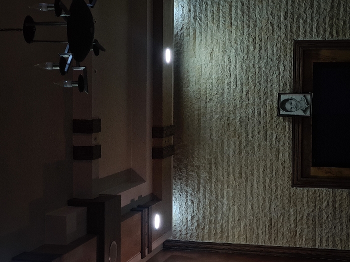 This image depicts an interior room within the city of At-Tall, Syria. The ceiling features a multi-tiered design with integrated dark beam-like structures and several recessed lights. A dark, four-arm chandelier with candle-shaped bulbs hangs from the ceiling on the upper right. The main wall is covered with light-colored, textured stone or brick veneer, illuminated by two recessed spotlights which create distinct highlights and shadows. Centered on the lower portion of the wall is a dark wooden frame, possibly for a television or a fireplace. Resting on top of this frame is a small, framed black and white portrait, which depicts a young individual, likely a female, with dark hair and a slight smile, looking directly forward. No live individuals or active scenes are present.