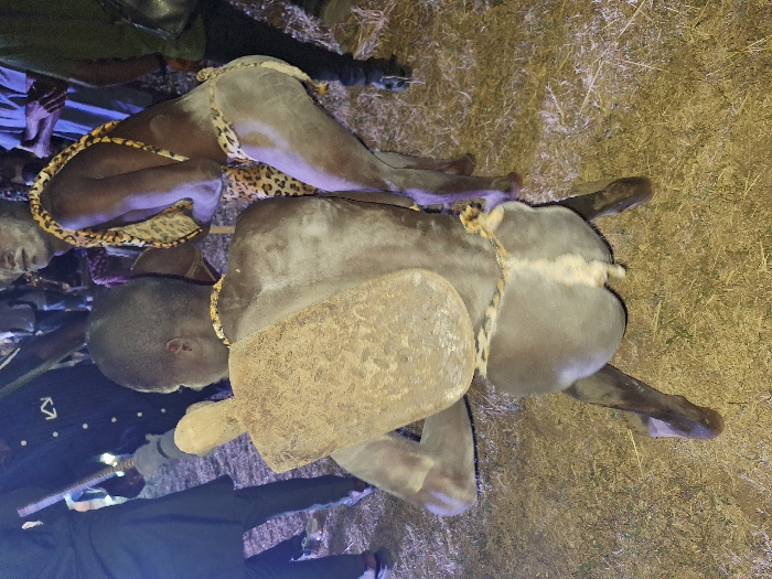 Two individuals are seen on what appears to be grassy ground. The person in the foreground has dark skin, shaved hair, and wears a traditional outfit. A large, rectangular, possibly wooden or hide shield is strapped to their chest. The person behind them has similar attire with a leopard-print strap. They appear to be part of a cultural or ceremonial event. Some other individuals are partially visible in the background.