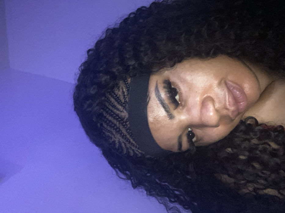 A close-up portrait shows an individual with a medium-to-dark complexion, featuring dark, curly hair styled with cornrows visible beneath a black headband