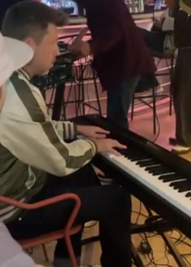 A man sits on a red metal chair and plays a black electronic piano in an indoor setting. He wears a cream-colored jacket with green stripes and black jeans with gray sneakers. A person wearing a gray hooded sweatshirt is partially visible in the foreground. Behind the pianist are several other people, including a man with a dark maroon-colored jacket. Some are near a bar area with bottles and neon lights. The piano has black keys and sits on a black metal stand with visible wires. The scene has a casual atmosphere with people mingling around the musician.