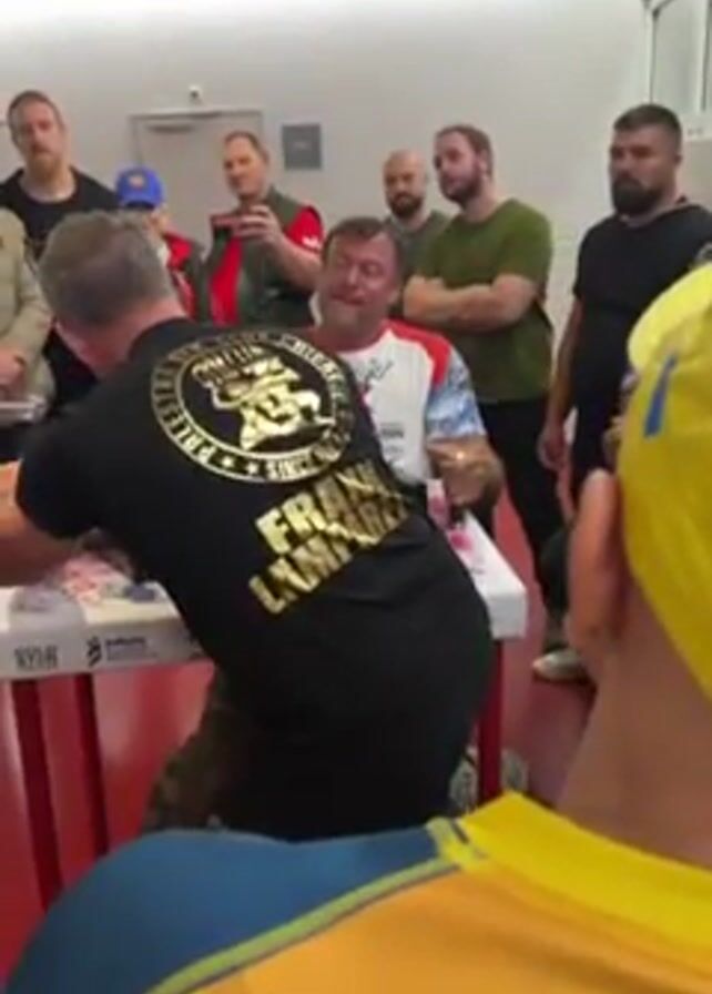 A group of men are gathered around a table where two men are arm wrestling. The man on the left wears a black shirt with gold lettering. The man on the right wears a white, red and blue shirt. Several men stand around observing, and one person holds a phone to record. A door is visible in the background.