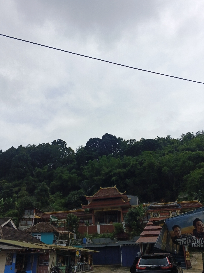 The image depicts an outdoor scene under an overcast, light grey sky. A thin black utility cable spans horizontally across the upper portion of the frame. The background is dominated by a steep, densely forested hillside covered with dark green trees. In the midground, a prominent traditional temple building is situated against the hillside. This structure features a multi-tiered, ornate red-tiled roof with upturned eaves and golden embellishments, red exterior walls, and several windows. Below and to the sides of the temple, various smaller, less ornate residential-style buildings are visible, some with light blue walls and corrugated metal roofs. In the lower foreground, a dark-colored SUV is parked, seen from the rear, with its tail lights visible. To the right of the SUV, a large advertising banner or billboard is partially obscured by a building roof and the vehicle. The visible portion of the banner displays two male figures and text written in Indonesian: "TERANG SURYA NIKMATNYA TERGA." A white motorcycle is parked near a lower-left building. The ground in the immediate foreground appears to be unpaved or dirt. The scene's architectural styles and the hilly, forested environment are consistent with urban fringe areas in Dalat, Vietnam, particularly those featuring Buddhist temples. However, a specific identifiable landmark in Dalat matching the prominent temple structure is not discernible from the image, and the presence of Indonesian text on the advertising banner is an incongruous detail for Vietnam.