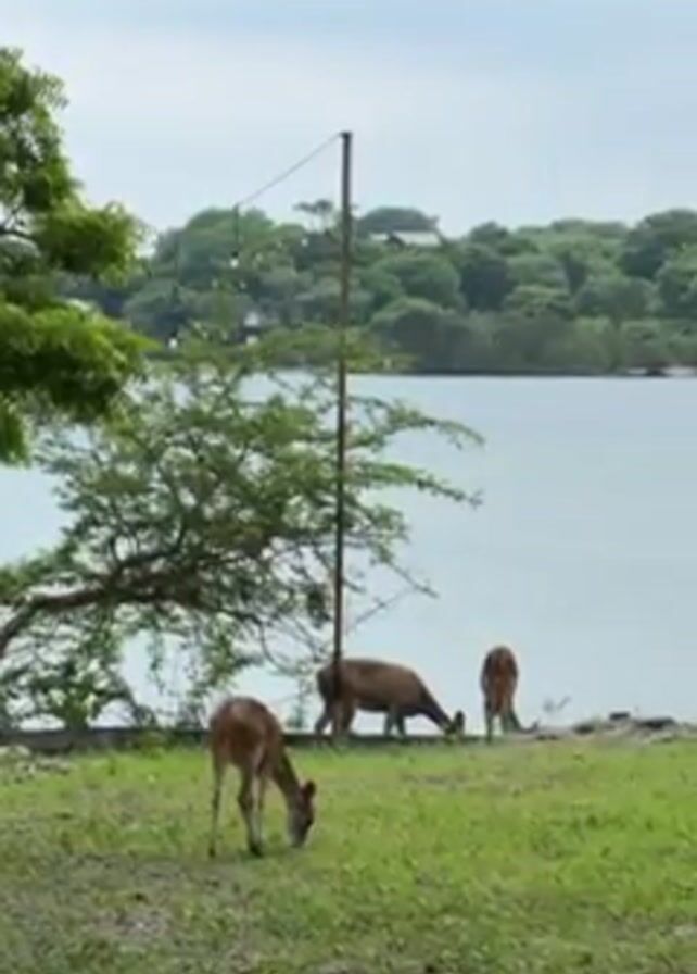 The video depicts three deer grazing on a grassy shore next to a body of water, likely a lake or bay. The deer are brown and have slender legs. The foreground is dominated by green grass and a tree with lush foliage, partially obscuring the view. A tall, thin metal pole, strung with decorative lights, stands nearby. Beyond the grassy area, the water stretches out to a distant shoreline covered with trees and vegetation, creating a natural backdrop. The sky is overcast, suggesting a cloudy day.