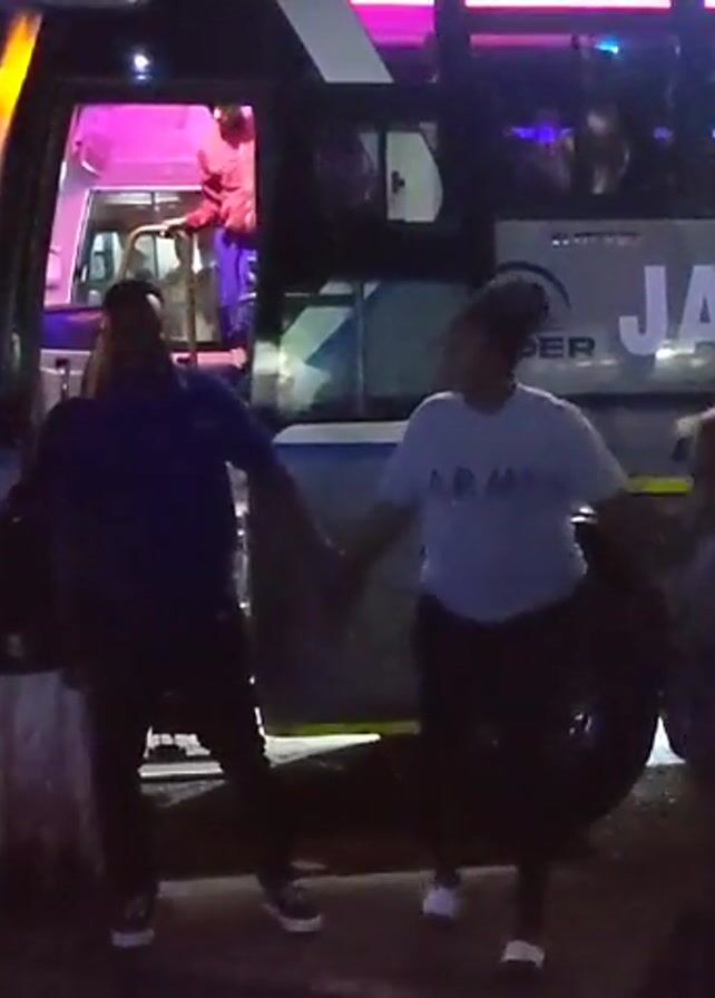 group of people standing around a large "Jade Luxury" bus at night. The bus has colorful LED lights along the top. Several individuals are holding items above their heads, possibly luggage or containers. People are both near the bus's door and standing along the side. Some people appear to be helping passengers load the bus. There is a motorcycle in the background. The scene appears to be at a bus stop or terminal. The lighting is dim.