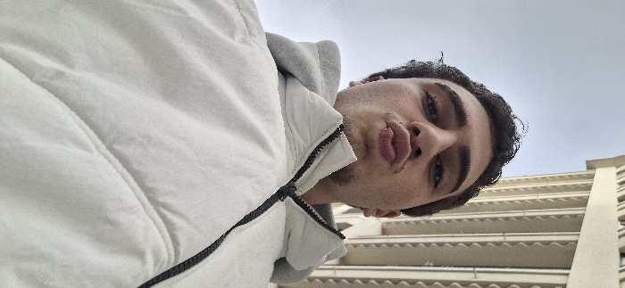 A low-angle, eye-level photograph captures a young adult male, approximately 18-25 years old, facing directly into the camera. He possesses short, dark, curly hair and light stubble on his chin and upper lip. His lips are pursed forward in a "kissing" gesture. He is wearing a light-colored, possibly white or off-white, padded or puffer jacket with a partially unzipped black zipper, revealing a grey hooded garment underneath. The jacket's collar is visible. The background consists of an overcast, light grey sky. To the right, a portion of a tall, light-colored building with distinct vertical architectural elements, possibly columns or structural fins, is visible. The specific building or precise location within Grenoble, France, is not discernible from the provided architectural details. There are no other individuals or prominent objects within the frame.