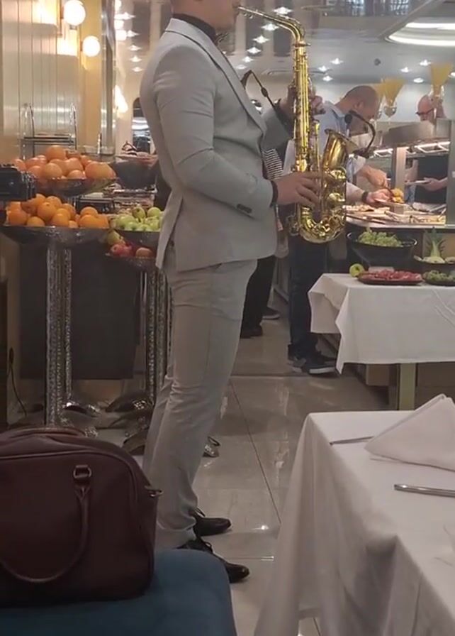 A man in a gray suit plays a golden saxophone in a restaurant. He is facing away from the camera and towards a food buffet table where people are selecting food. To the left of the man is a table with fruit, and to his right is a table with a white tablecloth and a napkin. A brown leather bag sits on a blue seat in the foreground. The restaurant has a mirrored ceiling and is well-lit. The man appears to be performing for the restaurant patrons.