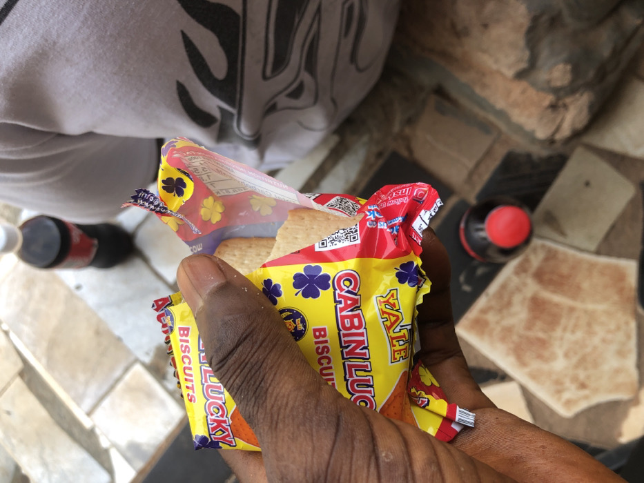 The scene, located in Enugwu-Ukwu, Nigeria, depicts a close-up view of a dark-skinned hand holding an opened yellow and red package of "CABIN LUCKY BISCUITS