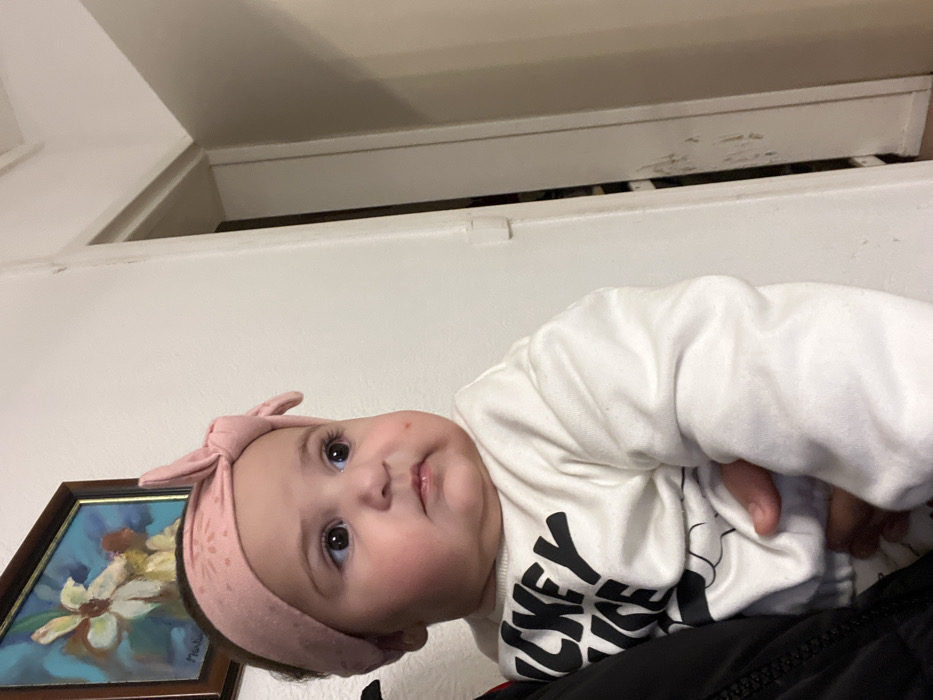 - "A baby with a pink headband is tilted towards the camera, wearing a white sweater with black lettering on the front" by FM-o1TYQ2, licensed under CC BY 4.0