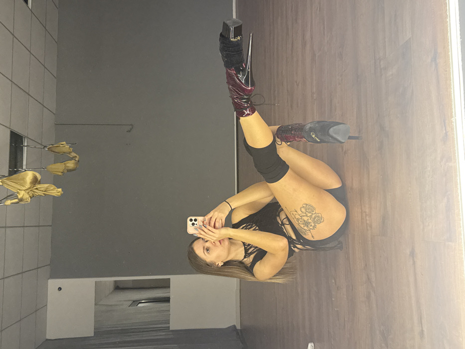 The image captures a female individual taking a mirror selfie inside an indoor studio located in Batumi, Georgia. The subject is situated on a light brown wooden floor, appearing to be reclined with her torso partially lifted. She wears a black fringed top, black short bottoms, black knee pads, and high-heeled boots featuring thick platforms and stiletto heels; the right boot is glossy dark red, and the left boot is primarily black with red accents. A floral tattoo is visible on her right upper thigh. She holds a light pink smartphone in her left hand, pointing it towards the mirror to capture the reflection. Her right arm is bent, providing support to her upper body. The reflected background consists of a plain grey wall, a white tiled ceiling, and two golden fabric slings suspended from the ceiling.