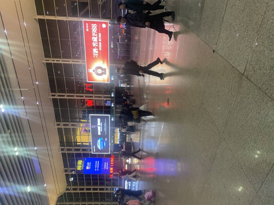 The image displays a brightly illuminated, expansive indoor public concourse, identified as being in Panyu District, China. The environment features a high, paneled ceiling equipped with linear and recessed spot lighting fixtures. A significant portion of the background consists of a tall glass facade supported by a dark metal grid structure. The floor is covered with large, light-colored, reflective tiles, showing distinct reflections of overhead lights and digital displays. Numerous individuals are observed traversing the space, primarily engaged in walking. In the immediate foreground on the right, three men are depicted walking from right to left. The man furthest right wears a dark jacket and dark pants, carrying a dark shoulder bag. The middle man is dressed in a black jacket, dark pants, and a dark cap, holding a mobile phone in his right hand. The man closest to the viewer is in a dark jacket and dark pants. In the mid-ground to the left, a person in a pink top and dark pants pulls a pink wheeled suitcase towards the left. Other individuals, generally in dark or neutral-colored casual attire, are distributed throughout the mid-ground and background, walking in various directions. The concourse contains several large, prominent illuminated LED advertising screens. A vertical blue screen on the left displays Chinese characters, including "问询" (Inquiry). Adjacent to it, a horizontal black-background screen features an advertisement for "STRIKE DAVID," including a male figure and blue abstract graphics. To the right, a large horizontal red-background screen showcases an advertisement for "习酒·窖藏1988" (Xijiu, Cellar Collection 1988), depicting a stylized bottle of liquor. The artificial lighting from the ceiling and these digital displays constitutes the primary illumination for the scene.