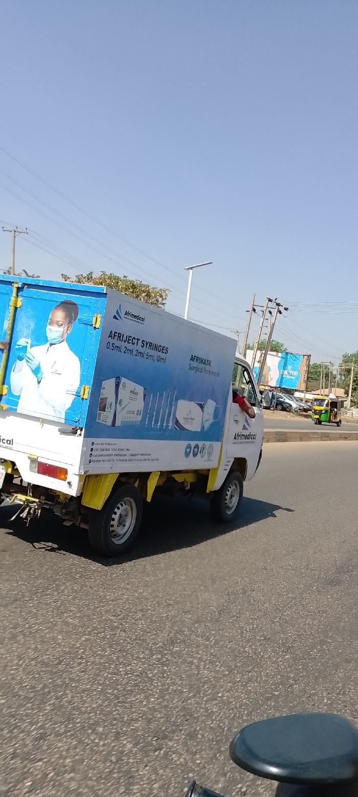 The scene in Dadi Riba, Nigeria, features a white and blue box truck moving rightward on an asphalt road under a clear, light blue sky. The truck's cargo box displays advertisements for "Afrimedical" products, specifically "AFRIJECT SYRINGES" and "AFRIMASK Surgical face mask." The left side of the cargo box features an image of a female medical professional in a lab coat, mask, and blue gloves, holding a syringe. Product boxes and individual syringes/masks are also depicted. A person's arm, wearing a red sleeve, is visible extending from the passenger-side window of the truck's cab. In the background, to the right, a yellow and green auto-rickshaw is positioned near several parked cars. The environment includes multiple utility poles with overhead power lines, a white street light, and a large billboard with partially legible text "BE CONFIDENT," all set against sparse trees and shrubs.