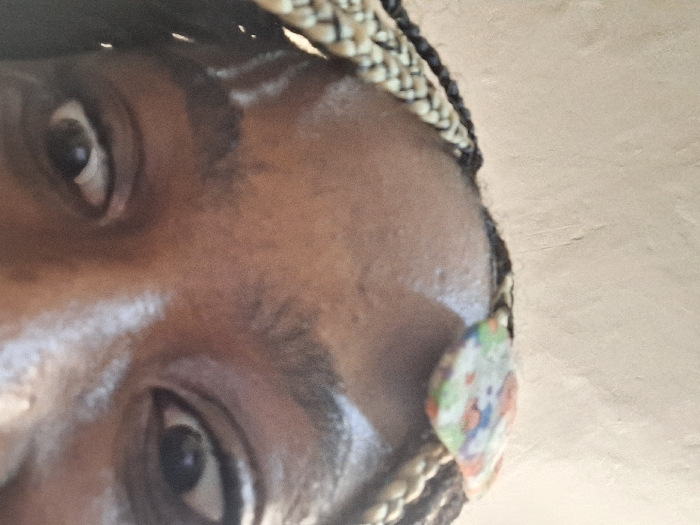 A close-up, slightly angled image shows a person's face. The skin appears brown. Two eyes are visible, both with dark pupils. Braids line the forehead. At the edge of the frame, near the hair, is a colorful, circular object. The background is blurry and off-white.