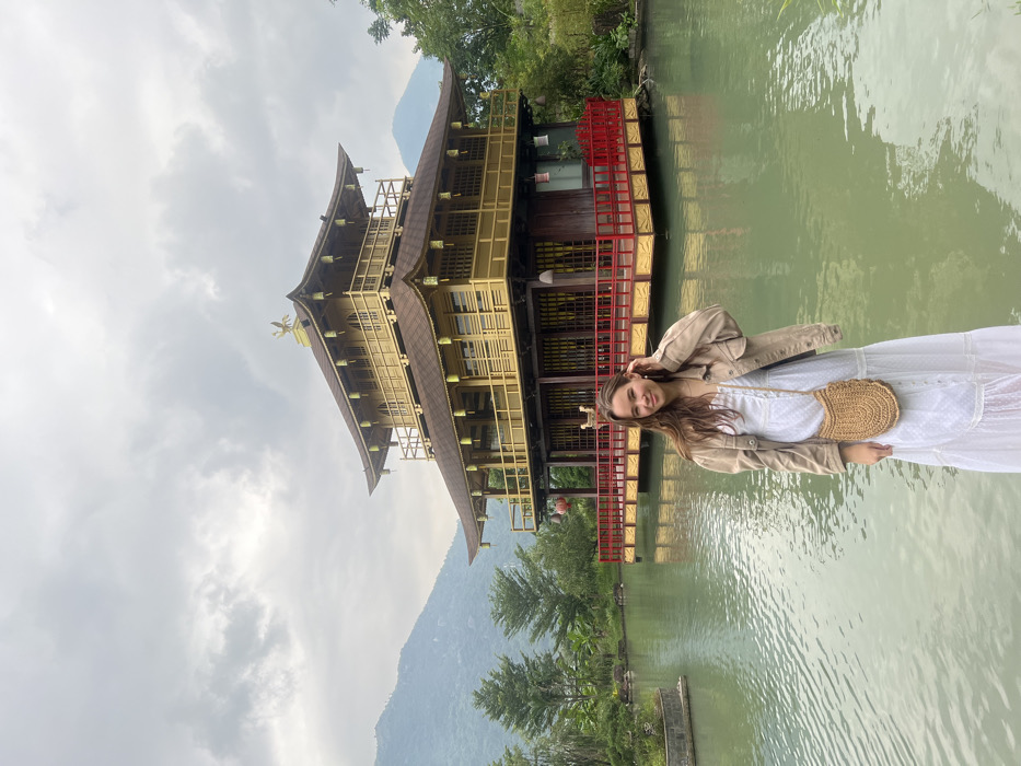 A young Caucasian female stands smiling directly at the camera in the foreground of a scene in the city of Unknown, Vietnam. She has long, wavy brown hair and is dressed in a white sleeveless maxi dress, layered with a light beige oversized jacket. A light brown, woven crescent-shaped bag is worn cross-body. Her left hand is raised towards her right ear. Behind her, across a tranquil, greenish-blue body of water, a three-tiered golden pagoda-style building with dark brown roofs is prominently featured. The building exhibits ornate East Asian architectural elements, including upturned eaves, numerous small bell-like ornaments suspended from the eaves, and a golden finial resembling a mythological bird at its apex. The lowest level of the structure has a red railing with golden supports facing the water, and red lanterns are visible. The surrounding environment includes lush green trees and vegetation on the banks of the water, with a small, circular vegetated island visible to the left. In the background, verdant mountains rise under an overcast, cloudy sky, contributing to a muted lighting condition.