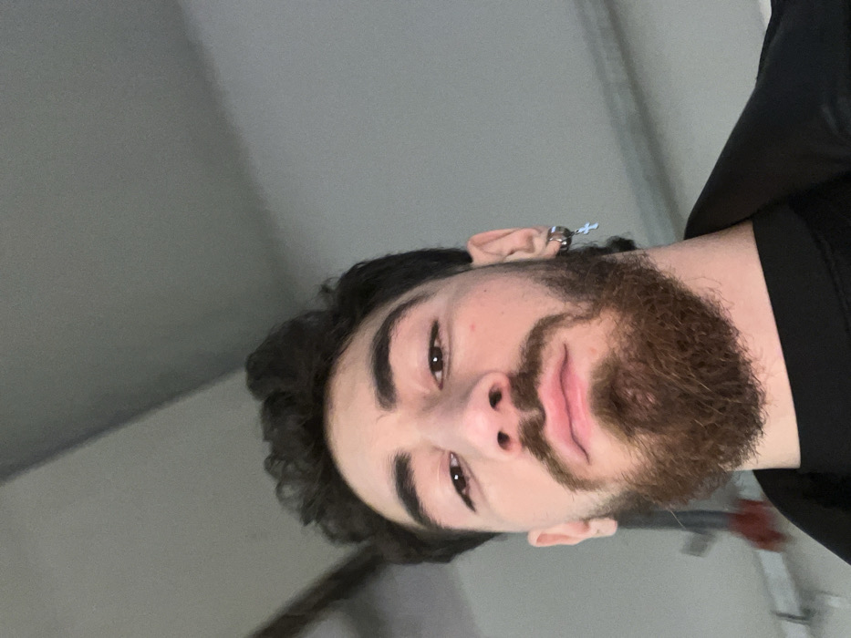 A person with dark curly hair and a thick, light brown beard is facing the camera