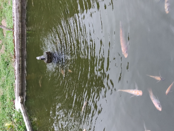 This image displays an artificial pond or water feature, likely situated in Nieste, Germany. The pond contains murky, dark green water. A light-colored concrete or stone border is visible along the top edge of the pond, beyond which green grass and indistinct foliage are present. Centrally located towards the top half of the pond is a dark, cylindrical fountain nozzle actively spraying a stream of water upwards, creating prominent concentric ripples on the water's surface. Numerous fish, primarily light-colored ranging from white to pale orange or light brown, are observed swimming within the pond. At least ten individual fish are discernible, varying in size, with some larger specimens appearing to be koi or similar species, particularly evident in the lower half of the frame. No people are present in the scene.
