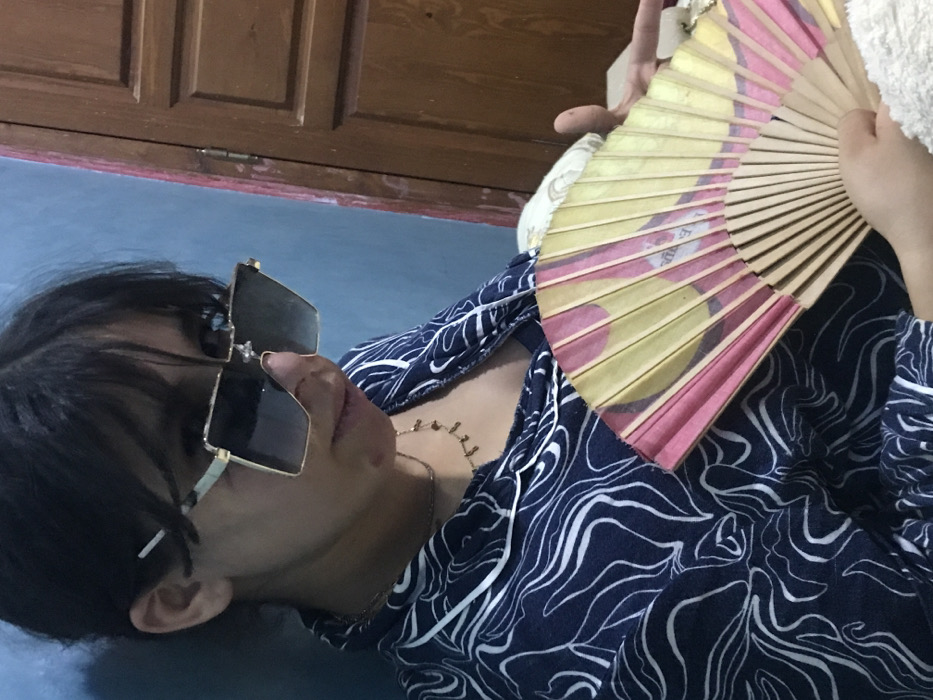 An individual is depicted indoors, within a location specified as Ouislane, Morocco. The subject is a person, likely female, with dark hair and bangs, positioned off-center to the left. They are wearing oversized, rectangular sunglasses with dark lenses and a gold-toned frame, featuring a clear or white section on the temples. The individual wears a navy blue shirt adorned with a white, abstract, wavy line pattern. A delicate gold-colored necklace with small, clustered pendants is visible around their neck. The person holds a partially open folding hand fan in both hands, positioned in the lower right quadrant of the image. The fan features alternating panels of pink and yellow, with light-colored wooden ribs. The background consists of a solid blue wall on the left and center, transitioning to a light brown wooden door with vertical panels and visible metal hinges on the right. A textured, light-colored surface, possibly a blanket or towel, is partially visible in the lower right corner, beneath the fan. The subject's gaze is directed downward and to the left, through the sunglasses. There are no overt actions beyond holding the fan and looking. No direct interactions with other individuals or subjects are observable.