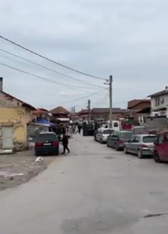 street scene with people walking down the road. On the right side of the road, several cars are parked. The road surface appears to be cracked or uneven. Buildings line both sides of the street, with a mix of architectural styles visible. The sky is overcast, suggesting it might be a cloudy day. A person in a dark jacket is seen walking along the side of the street carrying what appears to be audio equipment. There seems to be some kind of gathering or activity occurring further down the street, as suggested by the crowd of people in that area.