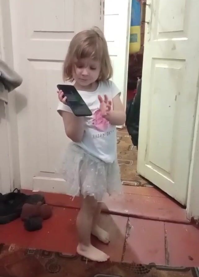 A little girl with blond hair is standing barefoot indoors, holding a black smartphone in her left hand