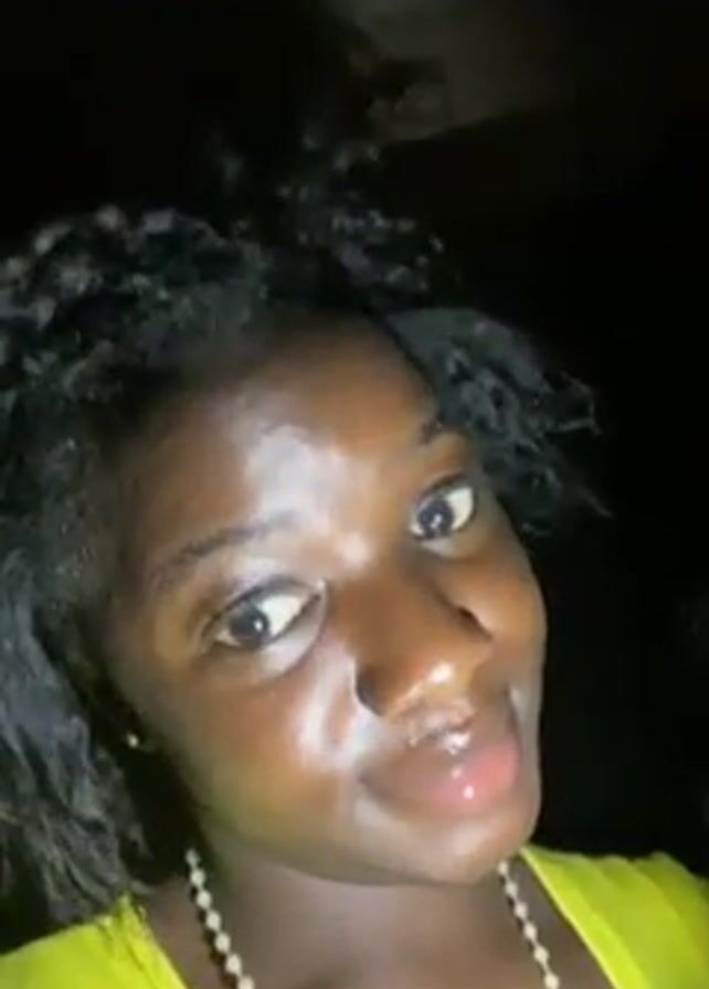 A person with dark skin and black hair is looking into the camera. The person is wearing a bright yellow top and a white beaded necklace. The background is dark, suggesting the video was taken at night or in a low-light setting. The person's face is slightly shiny, possibly due to lighting or moisture. The camera is moving slightly, giving a handheld feel to the video.