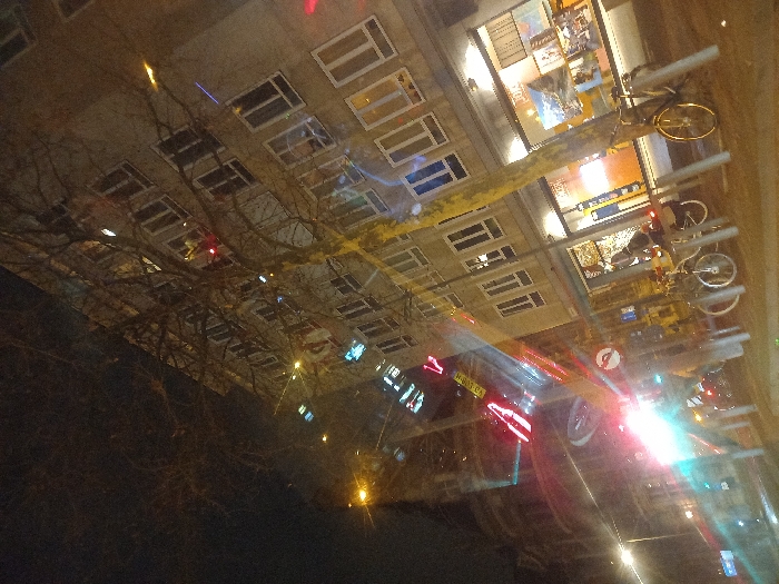 An urban night scene shows a multi-story building with numerous windows on the upper floors. Bare tree branches obscure parts of the building. Bike racks hold bicycles in front of a store with illuminated displays. Streetlights and car headlights create streaks of light and blur the foreground. A pedestrian crossing sign is also visible. The image is rotated.