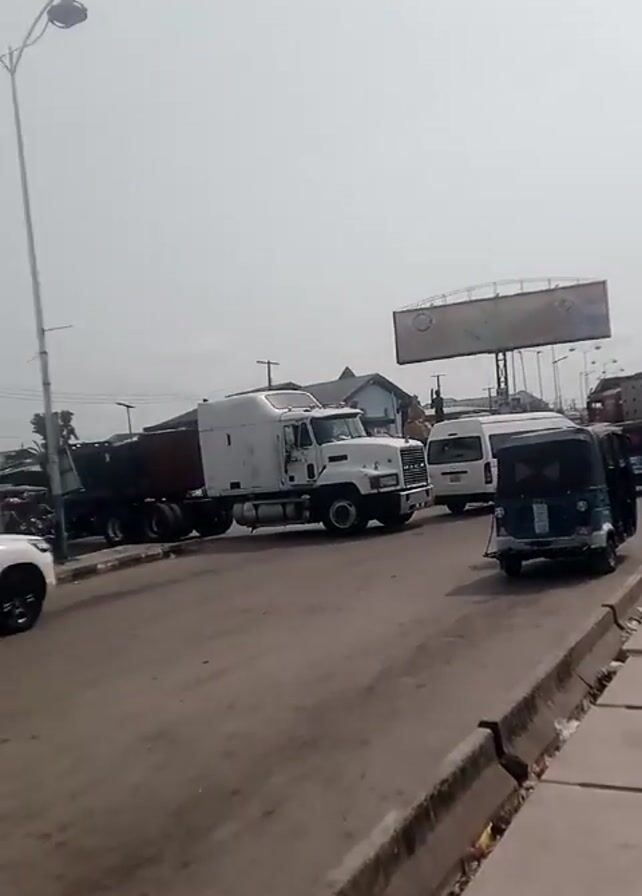 The video depicts a street scene in an urban environment, likely in a developing country. The sky is overcast, casting a diffuse light over the scene. The road appears to be paved but somewhat worn, with a concrete curb and drainage ditch running along the side. Various vehicles are present, including a large white semi-truck, a white van, and several three-wheeled vehicles known as "tuk-tuks" or "keke napeps," which are common forms of transportation in some regions. Motorcycles are also seen moving through the traffic. People can be seen walking along the sidewalk and interacting with the vehicles. A large billboard stands prominently in the background, but the content of the advertisement is not discernible. The buildings in the background appear to be a mix of residential and commercial structures, giving the impression of a bustling urban area. The overall atmosphere of the video suggests a busy and lively street scene, typical of a developing urban area.