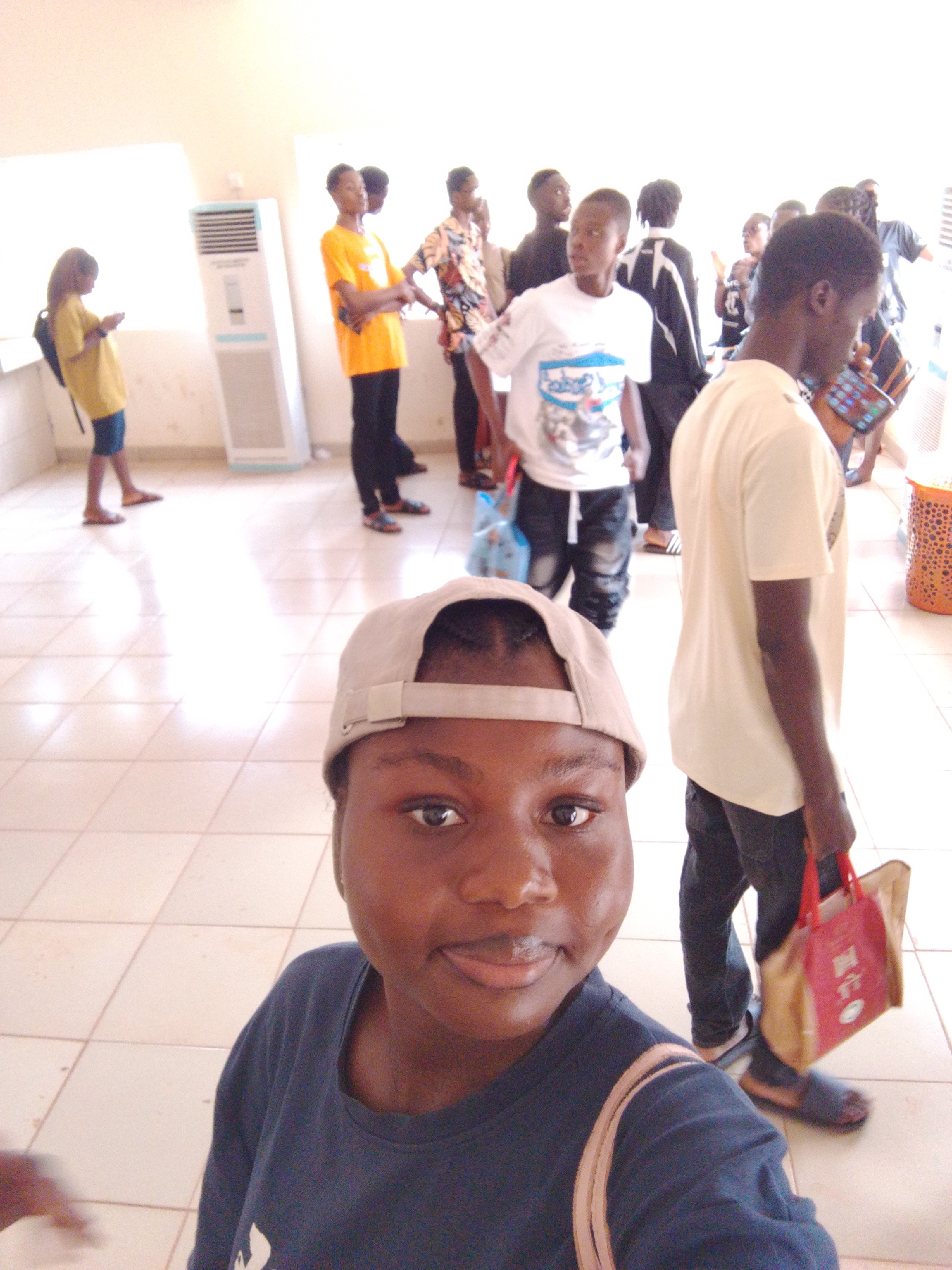 The image depicts an indoor scene within a building in Nsukka, Nigeria. In the immediate foreground, a young individual with dark skin, wearing a dark blue long-sleeved shirt and a backward light beige baseball cap, takes a selfie, looking directly into the camera. The background presents a brightly lit room with a reflective, light-colored tiled floor. Approximately ten to fifteen other young individuals are distributed throughout the midground and background, predominantly standing or in casual motion. On the left side of the scene, a person wearing a yellow t-shirt and blue shorts, with a dark backpack, is focused on a smartphone. Adjacent to this person stands a tall, white floor-standing air conditioning unit. In the central background, individuals are dressed in varied casual attire, including one in a bright orange t-shirt, another in a white graphic t-shirt with ripped dark jeans carrying a light blue plastic bag, and a person in a black and white track jacket. Towards the right, a person in a light cream-colored t-shirt is holding a red and gold fabric bag. An orange, woven waste bin with dark spots is visible on the far right. The individuals in the background appear to be independent, without clear direct interactions.