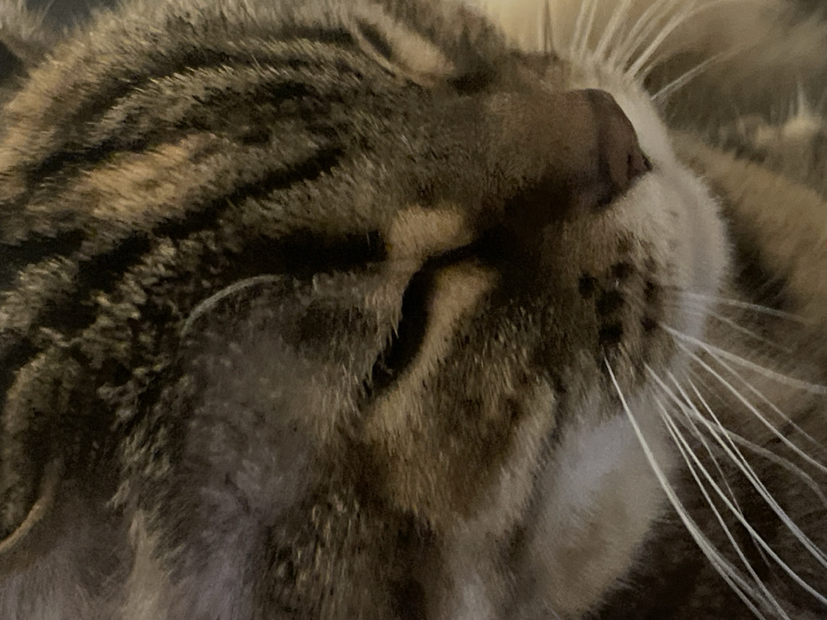 - "A close-up captures the face of a tabby cat in repose" by FM-T5EOT2, licensed under CC BY 4.0
