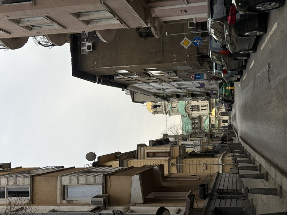 This image depicts an urban street scene in Sofia, Bulgaria, looking eastward towards the Alexander Nevsky Cathedral. The street, consistent with the appearance of Oborishte Street, is bordered by multi-story residential or mixed-use buildings under an overcast sky. In the immediate foreground, a damp asphalt road surface recedes into the distance. Along the left curb, a sidewalk is delineated by a row of eight dark grey cylindrical bollards. The building on the left is a multi-story structure, primarily beige and brown, featuring ornate cornices, bay windows with white frames, and two wall-mounted air conditioning units. A grey satellite dish is affixed to an upper portion of this building's facade. A tall, grey streetlamp is visible midway down the left sidewalk. On the right side of the street, a line of parked passenger vehicles extends from the foreground into the midground. The closest vehicle is a dark SUV, followed by several other cars including a green sedan. The buildings on the right are also multi-story, varying in color from light pinkish-beige to dark brown. These structures feature multiple windows, some with wrought-iron balconies, and an exposed air conditioning unit on an upper floor. Three visible street signs are affixed to a pole near the parked cars: a yellow diamond sign (indicating a priority road), a blue circular sign (indicating mandatory straight or right turn), and a smaller blue rectangular sign beneath it. In the distant background, the prominent Alexander Nevsky Cathedral dominates the central view. Its distinctive green-patinated copper domes and white stone facade are clearly visible, with a large golden bell tower dome rising above the main structure and a smaller golden dome visible at ground level. A few indistinct figures are observable walking on the distant left-side sidewalk, near the cathedral.