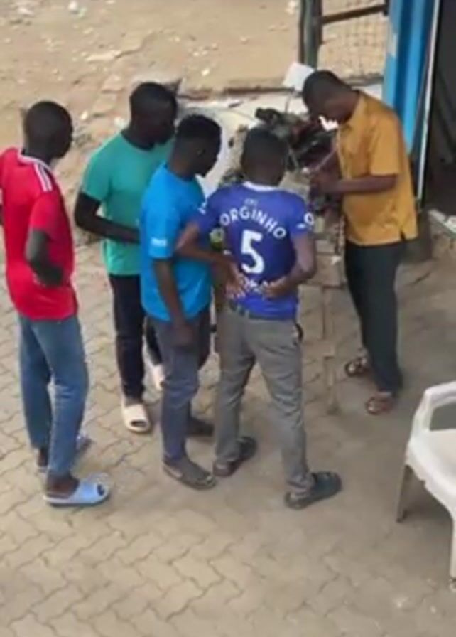 Five men stand on a paved, outdoor surface, gathered around a small work table. One man, wearing a yellow shirt and dark pants, works on something on the table. The other four watch him intently. One man is in a red shirt and blue jeans, one is in a teal shirt and dark pants, another is in a blue shirt with a "Core" logo and dark pants, and the last man is wearing a blue Chelsea jersey with "Jorginho 5" on the back and gray pants. The area looks like an outdoor workspace, with various items scattered around. A blue shipping container is visible in the background.