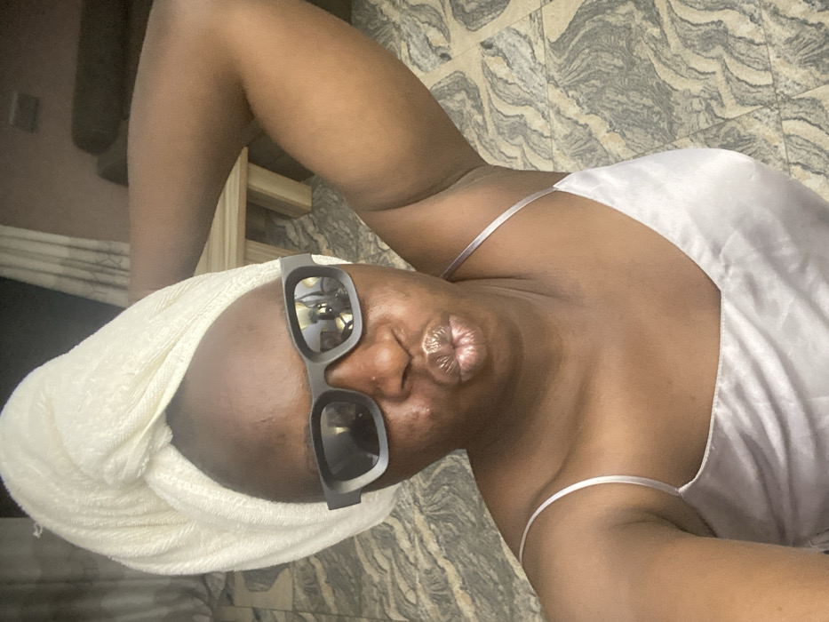 A person wearing black framed sunglasses and a white towel wrapped around their head is laying down. They have their lips pursed. The person is wearing a light colored, satiny camisole with thin straps. A marble floor is visible. The person's arm is raised.