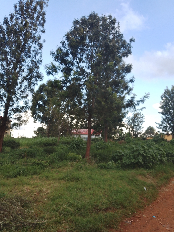 grassy hillside with several trees. There are a few small bushes and plants in the foreground. The hillside slopes down towards the bottom of the image, where there is a dirt path. The sky is blue with some white clouds. The location is in Ruaka, Kenya. There are no people visible.