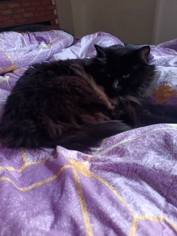 - "A black, fluffy cat is curled up on a purple and white patterned bedspread" by FM-Fezcd2, licensed under CC BY 4.0